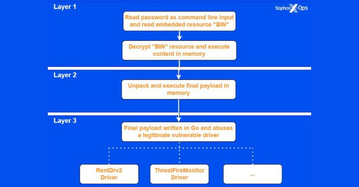 Bir parola dizesi girişiyle birlikte komut satırı aracılığıyla yürütülen yürütülebilir dosya, BIN adlı gömülü bir kaynağın şifresini çözer ve bellekte yürütür. BIN kaynağı, Go tabanlı nihai, gizlenmiş bir yükü açar ve çalıştırır, bu da daha sonra yükseltilmiş ayrıcalıklar elde etmek ve EDR yazılımını devre dışı bırakmak için farklı savunmasız, meşru sürücülerden yararlanır.